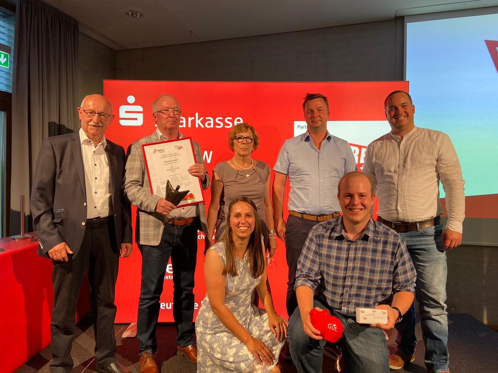 Der Wettbewerb VORBILDER 2019 der Württembergische Sportjugend des WLSB e.V. richtete sich an alle Personen in den Sportvereinen Baden-Württembergs, die Kinder und Jugendliche betreuen und mit Ihnen zusammenarbeiten. Gesucht wurden Ehrenamtliche aus dem Jugendbereich, die sich in herausragender Form für den Nachwuchs einsetzen, sich vorbildlich um die jungen Sportler kümmern und sich in besonderer Weise für gesellschaftliche Werte einsetzen und diese vermitteln. Entscheident ist das vorbildliche, ehrenamtliche Engagement über viele Jahre im Verein. Auf Grund der Pandemie wurde die Verantaltung nun am vergangen Freitag in Stuttgart im SpOrt nahe der Mecedes Benz Arena im feierlichen Rahmen nachgeholt. Unter den zehn Preisträgern wurde Roland Huber vom Sportverein Zunsweier geehrt, es wurde Ihm eine Urkunde, ein Preisgeld sowie eine Statue Victor überreicht. Bild: v. links: Präsident Thomas Schmidt SBFV, Preisträger Roland Huber, Ehefrau Edeltraud Huber, Söhne Sven und Simon Huber. vorne: Initiatoren seitens des SVZ Martina Müller und Mickey Vetter
